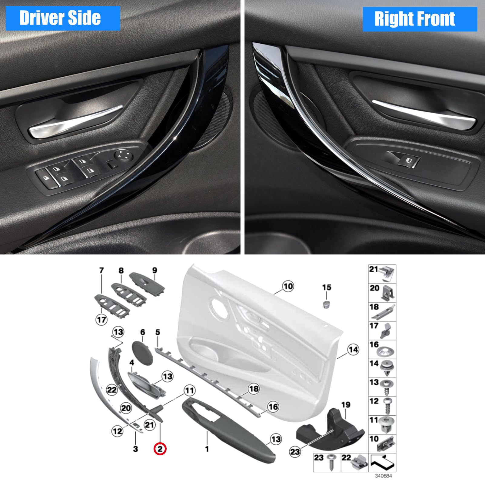 • Compatible Vehicle: 2PCS Left Front Driver Side and Right Front Passenger Side Door Pull Handle Replacement Compatible with BMW 3 Series: 316i,318i,320i,325i,328i,330i,335i,340i,M3 2012-2018 (F30 Sedan/F31 Touring/F80 M3 Sedan). And Compatible with BMW 4 Series: 428, 435,M4 2014-2017(F32/F33/F36/F82/F83). Half Part Door Handle, The Trim Outer Cover is NOT included!